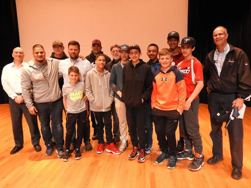 As baseball coaches and young ballplayers start streaming into the lobby of the Miller Center, it becomes very clear that Cathleen Stephens, Director of the Miller Center for the Arts, and Natalie Babb, Outreach Coordinator, have done an excellent job of community outreach. The Reading youth baseball community is here. There’s a nice buffet and reception, volunteers from the community are helping, the kids are gathering around the buffet table, wolfing chicken tenders, there is a a lovely community feel to it. One Reading team, from an outlying area, is made up mostly white kids, while an inner city Reading team has mostly Latino and black kids. It’s explained to me that Reading, with the highest per capita poverty rate in the country, is like a doughnut, with a prosperous and white outer circle and an impoverished center.